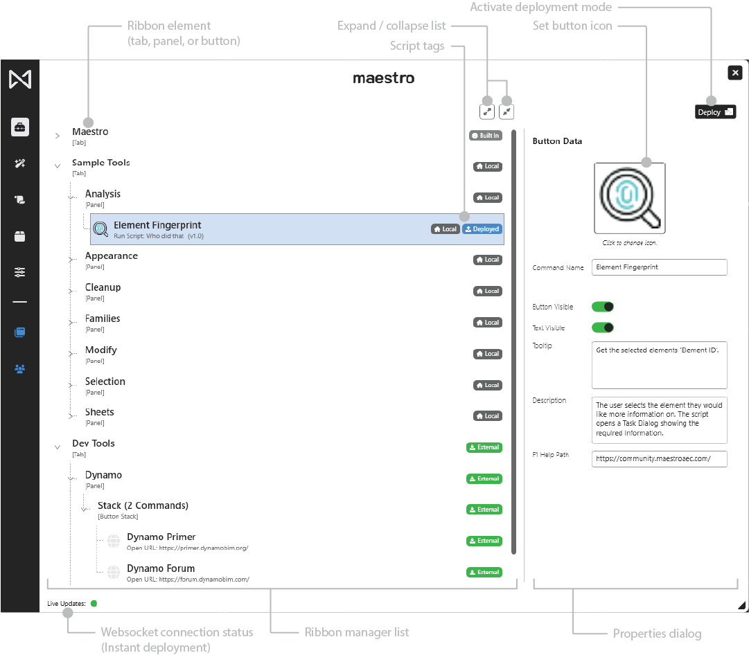 The Ribbon Manager Panel is where users design, organize, and configure the custom Revit ribbon layout used in Maestro. This includes tabs, panels, buttons, and button stacks. It provides complete visual control over how tools appear inside Revit.