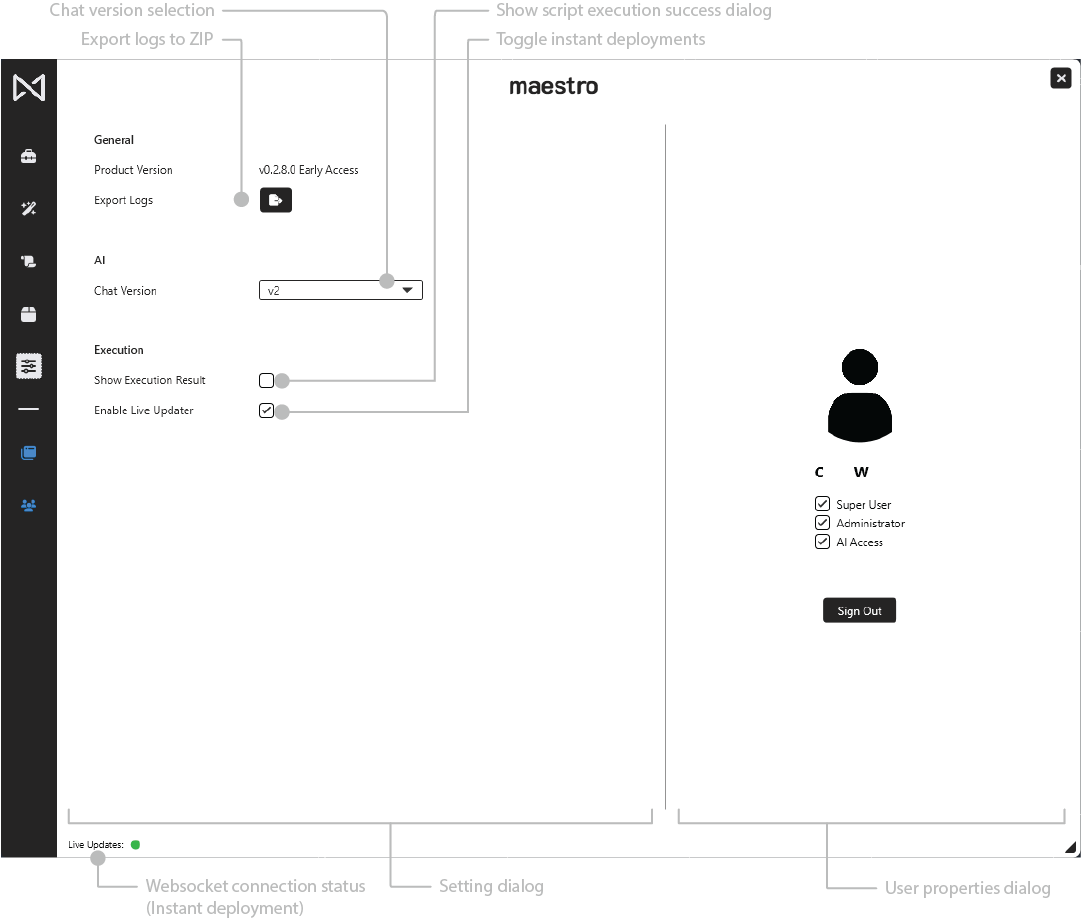 Displays the currently installed version of Maestro, including build number and Early Access identifiers where applicable.